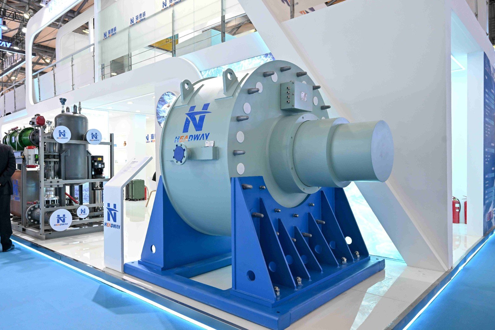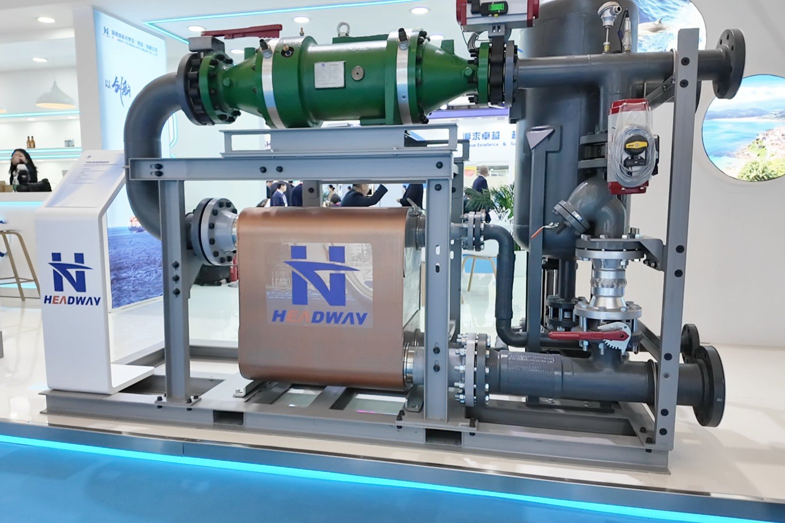 本屆展會,海德威科技集中呈現(xiàn)了一系列最新自主研發(fā)的低碳航運和能效提升解決方案,涵蓋船舶ORC廢熱發(fā)電系統(tǒng)、船載碳捕集系統(tǒng)(OCCS)、替代燃料(甲醇/氨/LNG)供給系統(tǒng)、燃料閥組單元(FVU)、船舶尾氣脫硫系統(tǒng)(EGCS)、新型軸帶發(fā)電機系統(tǒng)、智慧船舶系統(tǒng)及制氫儲氫供電系統(tǒng)等產品實物與比例復刻模型,吸引了各界嘉賓駐足交流,共同探討低碳航運的未來發(fā)展與合作機遇。