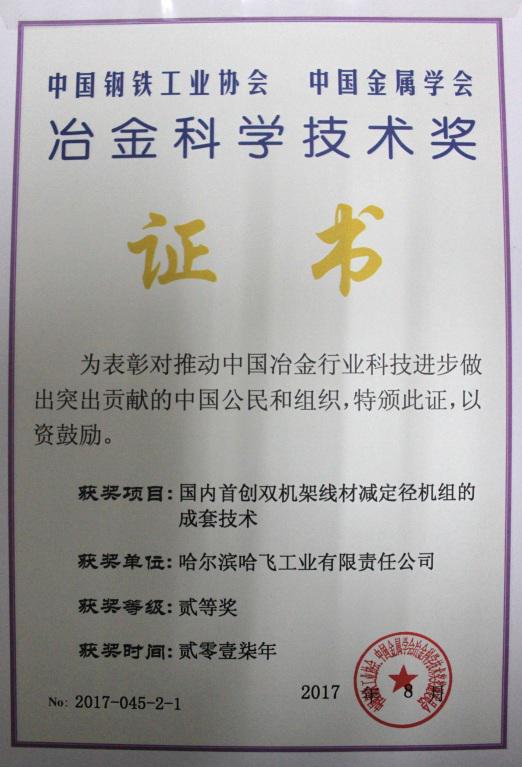為表彰對推動中國冶金行業(yè)科技進步做出的突出貢獻,冶金科學技術(shù)獎獎勵委員會決定對78個項目授予2017年中國鋼鐵工業(yè)協(xié)會、中國金屬學會冶金科學技術(shù)獎,我公司“國內(nèi)首創(chuàng)雙機架線材減定徑機組的成套技術(shù)”獲得二等獎。我公司是冶金系統(tǒng)外的冶金設備制造商獲得此獎項,標志雙機架線材減定徑機組成套技術(shù)對中國冶金行業(yè)科技創(chuàng)新、技術(shù)進步有重要意義。